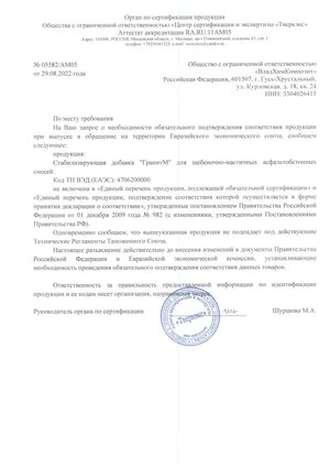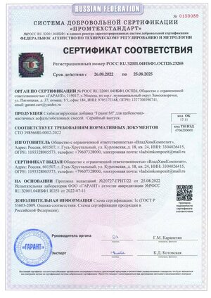 Стабилизирующая добавка Гранит-М представляет собой спрессованные гранулы целлюлозного волокна с органическим связующим. Выпускается по CTO 39856680-0002-2022 «Гранулированный стабилизатор «Гранит-М» для щебёночно-мастичных и асфальтобетонных смесей. Технические условия». Стандарт организации согласован Федеральным дорожным агенством РОСАВТОДОР. Добавка запатентована, и имеет санитарно-эпидемиологическое заключение, сертификат соответствия в области дорожного хозяйства.